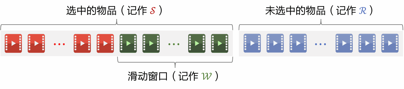 • 解决方案:设置一个滑动窗口 W\mathcal{W},比如最近选中的 10 个物品,用 W\mathcal{W} 代替 MMR 公式中的 S\mathcal{S}