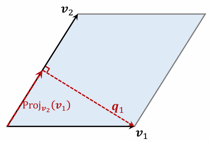 q1=v1Projv2(v1).\mathbf{q}_1 = \mathbf{v}_1 - \text{Proj}_{\mathbf{v}_2}(\mathbf{v}_1).